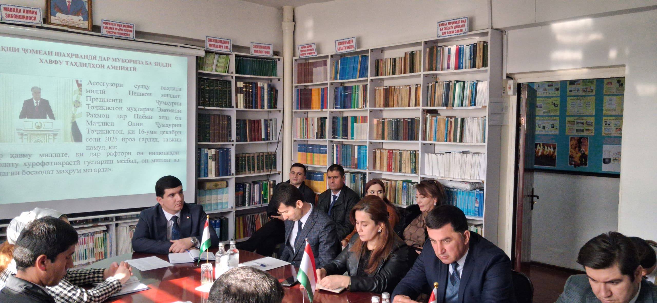 Дар ҳамоиш Мирзозода Мирзошариф Одина сармутахассиси шуъабаи ҳуқуқӣ Кумитаи забон ва истилоҳоти назди Ҳукумати Ҷумҳурии Тоҷикистондар мавзуи «Хурофот, таасуби динӣ ва бегонапарастӣ – монеаи рушди ҷомеа» баромад намуда, иброз дошт, ки Сарвари давлат муҳтарам Эмомалӣ Раҳмон хурофот ва бесаводиро хатарноктарин зуҳурот барои рушду инкишофи ҷомеаи тоҷик баҳогузорӣ намуда, таъкид доштанд, ки «фаромӯш набояд кард, ки вақте наврасону ҷавонон бесавод мемонанд, ҷомеа ба таассубу хурофот ва ҷаҳолат гирифтор мешавад, ки чунин ҳолат оқибатҳои даҳшатбор дорад. Ҳамватанони азизи мо хуб медонанд, ки ҷанги таҳмилии шаҳрвандии солҳои 90-уми асри гузашта тамоми соҳаҳо, хусусан, илму маорифро даҳҳо сол ба ақиб партофт. Мо бояд дар хотир дошта бошем, ки ояндаи давлату миллат аз насли босаводу донишманд, соҳибкасбу соҳибҳунар, соҳибмаърифату соҳибфарҳанг, дур аз таассубу хурофот, ватандӯсту ватанпараст ва дорои ҳисси баланди худшиносии миллӣ вобастагии амиқ дорад».